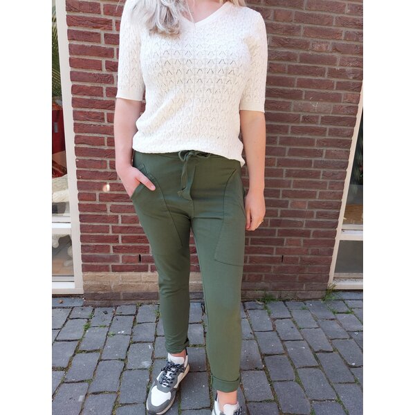 Jogginghose mit aufgesetzten Taschen. Diese Hose besteht aus Baumwolle und einem elastischen Material. Auf der Vorderseite befinden sich zwei große Seitentaschen und im Saum ein Kordelzug, um die Hose an Ort und Stelle zu halten.