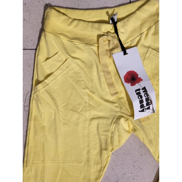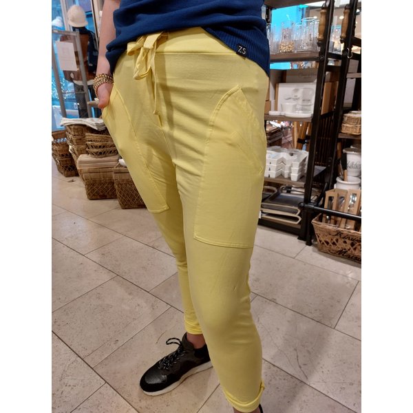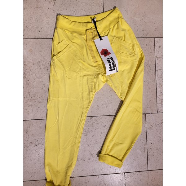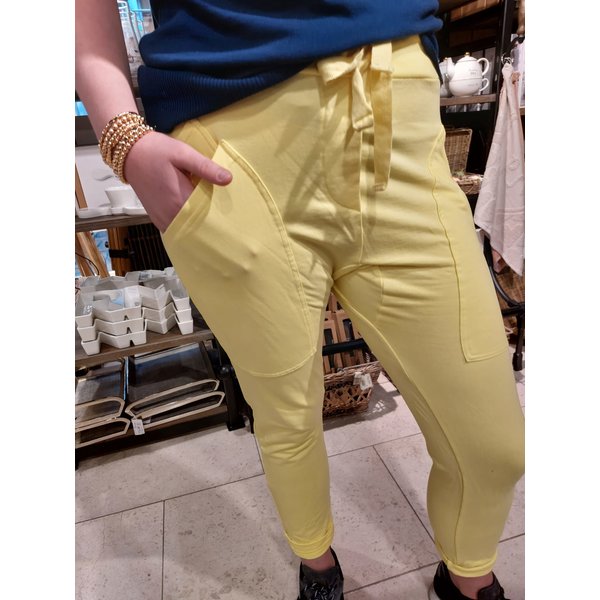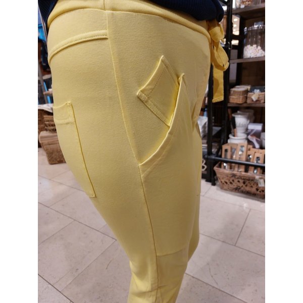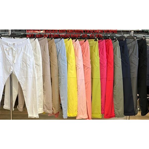 Jogginghose mit aufgesetzten Taschen. Diese Hose besteht aus Baumwolle und einem elastischen Material. Auf der Vorderseite befinden sich zwei große Seitentaschen und im Saum ein Kordelzug, um die Hose an Ort und Stelle zu halten.