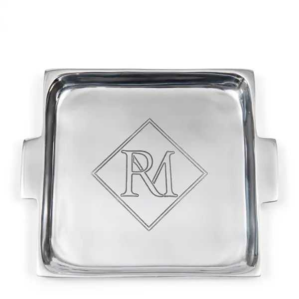 Un mini plateau argenté, doté de deux poignées pour une prise en main aisée. Le logo RM est subtilement gravé, lui conférant une allure élégante. Ce petit plateau pratique est parfait pour servir de petites collations ou des boissons et apporte une touche raffinée à toutes les occasions.