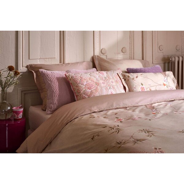 Het dekbedovertrek Bamboo Blossom toont een prachtig landschap van bloesembomen en bamboescheuten, met sierlijke vogels en een zandkleurige ondergrond. De achterzijde heeft een subtiele tegelprint. Het dekbedovertrek en de kussens zijn stijlvol afgewerkt met een doorgestikte rand en ronde bies aan beide zijdes. Ook hebben de hoofdkussens een unieke striksluiting.