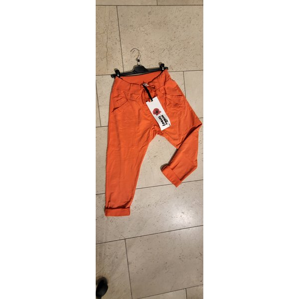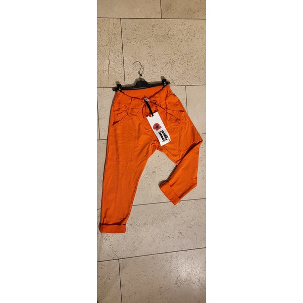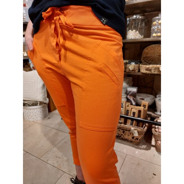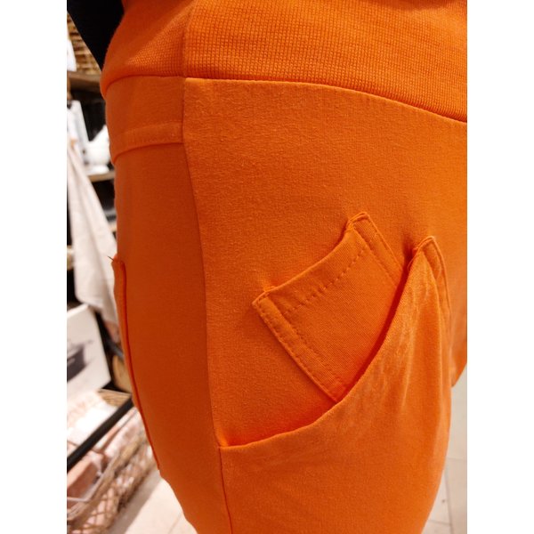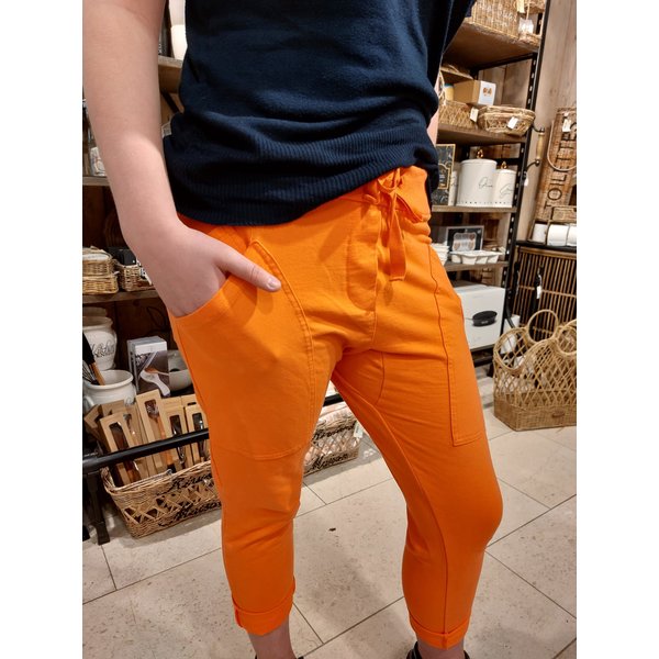 Jogging Broek met op gestikte zakken. Deze broeken zijn gemaakt van katoen en een elastisch materiaal. Aan de voorzijde zitten twee grote steekzakken en in de boord zit een ceintuur koord om de broek op z’n plek te houden.