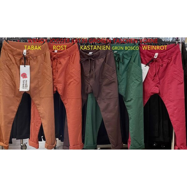 Jogging Broek met op gestikte zakken. Deze broeken zijn gemaakt van katoen en een elastisch materiaal. Aan de voorzijde zitten twee grote steekzakken en in de boord zit een ceintuur koord om de broek op z’n plek te houden.